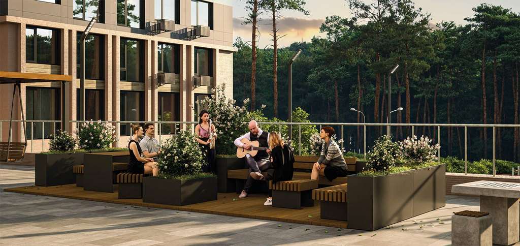 Архитекторы разработали концепцию, которая позволяет гармонично вписать проект в его природное окружение, используя оттенки белого, коричневого, терракотового цветов. Монолитные дома спроектированы с качественными фиброцементными фасадами. Просторные лоджии и панорамное остекление наполняют квартиры светом и воздухом и позволяют любоваться пейзажами.