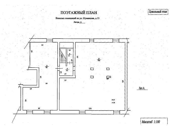 Объект муниципального нежилого фонда - нежилые помещения цокольного этажа пятиэтажного жилого здания (кадастровый номер 02: 55: 030169: 135) , расположенного по адресу: Республика Башкортостан, г. Уфа, Калининский район, ул. Шумавцова, 13. Муниципальная собственность. Запись в Едином государственном реестре прав на недвижимость № 02-04-01/159/2011-219 от 23.05.2011г. Прочие характеристики, техническое состояние: год постройки: 1957, материал стен: кирпич, высота помещений: 3,47м, наличие коммуникаций: центральное отопление, электроснабжение. Отдельный вход отсутствует, вход через подъезд жилого здания.