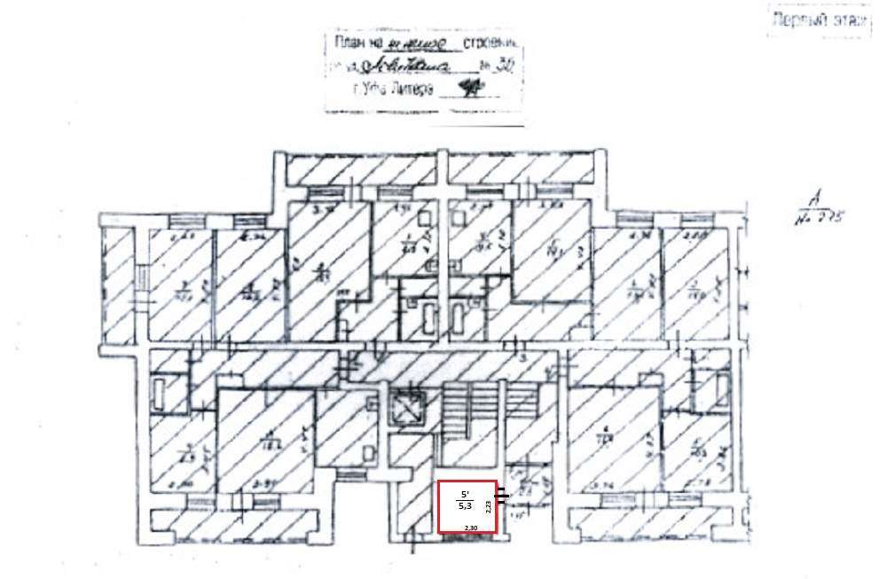 Нежилое помещение первого этажа девятиэтажного жилого здания. Кадастровый номер 02: 55: 050441: 682. Площадь 5,3 кв. м. Этаж / этажность-1 / 9. Обременения (ограничения) не зарегистрировано. Муниципальная собственность. Запись в Едином государственном реестре прав на недвижимость № 02-01/02-18/2004-199 от 20.02.2004г. Прочие характеристики, техническое состояние: год постройки: 1987, материал стен: кирпич, высота помещений: 2,45м, наличие коммуникаций: электроснабжение, центральное отопление Вход в объект через подъезд жилого дома. Адрес: Республика Башкортостан, г. Уфа, Дёмский район, ул. Левитана, 36