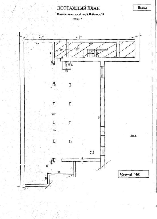 Нежилые помещения подвала четырёхэтажного жилого здания. Кадастровый номер 02: 55: 030154: 105. Площадь объекта 250,9 кв. м. Этаж / этажность-подвал / 4. Обременения (ограничения) не зарегистрировано. Муниципальная собственность. Запись в Едином государственном реестре прав на недвижимость №02-04-01/159/2011-222 от 23.05.2011г. Прочие характеристики, техническое состояние: год постройки: 1957, материал стен: кирпич, высота помещений: 2,58м, наличие коммуникаций: центральное отопление, электроснабжение. Вход в Объект через подъезд жилого дома. Адрес: Республика Башкортостан, г. Уфа, Калининский район, ул. Победы, 18.