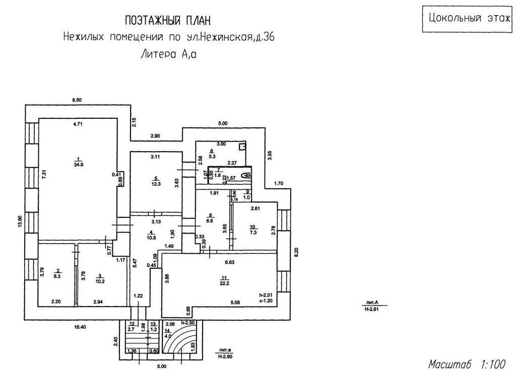 Нежилые помещения цокольного этажа двухэтажного жилого здания. Кадастровый номер 02: 55: 030160: 257. Площадь объекта 128,7 кв. м., в том числе: литера А 120,8кв. м., литера а (холодная пристройка, тамбур) 7,9кв. м. Этаж / этажность-цоколь / 2. Обременения (ограничения) не зарегистрировано Муниципальная собственность. Запись в Едином государственном реестре прав на недвижимость №02-01/02-102/2003-242 от 23.06.2003г. Прочие характеристики, техническое состояние: год постройки: 1942, материал стен: шлакоблок (литера А) , кирпич (литера а) , высота помещения: 2,51м (литера А) , 2,50м (литера а) , наличие коммуникаций: по литере А: центральное отопление, электроснабжение, водоснабжение, канализация, по литере а: коммуникации отсутствуют. Адрес: Республика Башкортостан, г. Уфа, Калининский район, ул. Нежинская, 36