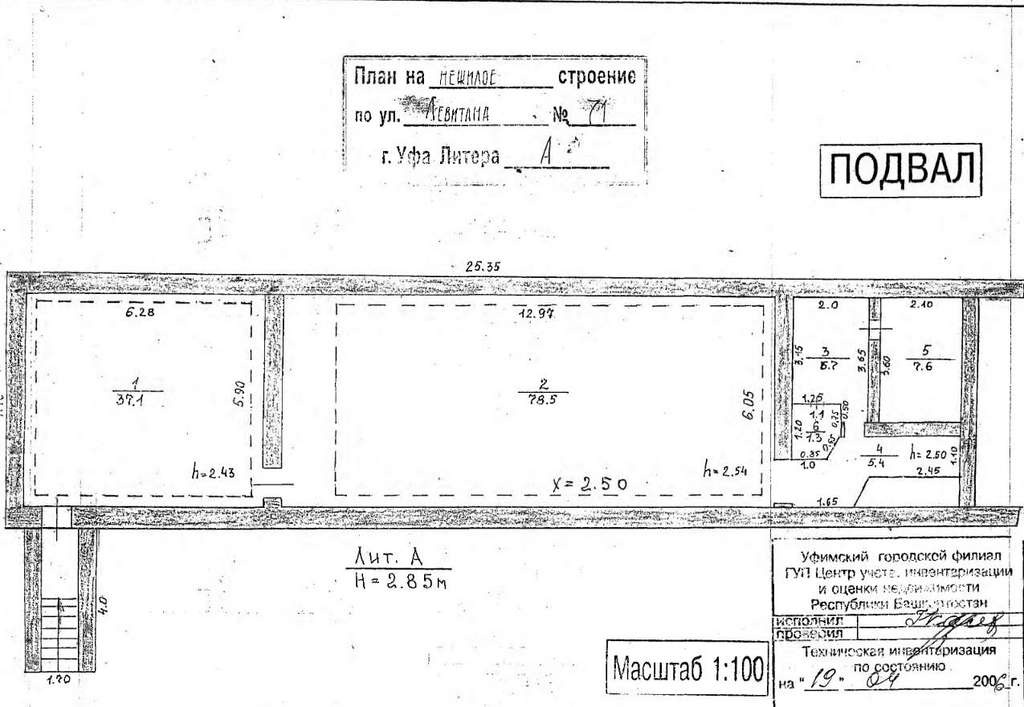 Нежилые помещения подвала девятиэтажного жилого здания. Кадастровый номер 02: 55: 050451: 37. Площадь объекта 136,6 кв. м. Этаж / этажность-Подвал / 9 Обременения (ограничения) не зарегистрировано. Муниципальная собственность. Запись в Едином государственном реестре прав на недвижимость № 02-04/101-04/301/007/2016-6424/1 от 28.10.2016г. Прочие характеристики, техническое состояние: год постройки: 1989, материал стен: кирпич; высота помещений: 2,43м., 2,50м., 2,54м. ; наличие коммуникаций: электроснабжение, отопление от групповой котельной, водоснабжение, канализация. В Объекте имеются общедомовые коммуникации. Покупатель обязан обеспечивать свободный доступ соответствующим службам в целях ремонта коммунальных, инженерных, электрических, других линий и сетей, проходящих через Объект. Адрес: Республика Башкортостан, г. Уфа, Дёмский район, ул. Левитана, 71